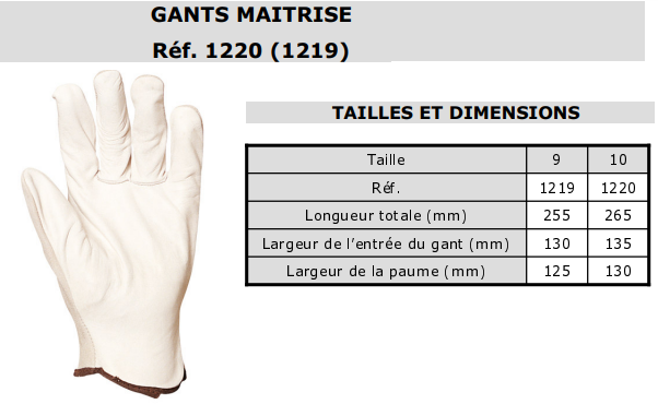 Gants maîtrise Pouce palmé Paume et index en fleur de vachette Élastique de serrage au poignet Dos en croûte Qualité standard