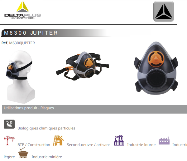 Demi-masque : Thermoplastique élastomère (TPE) + Polypropylène (PP).