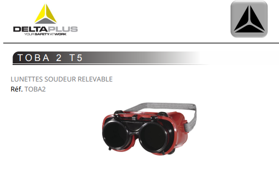 Lunettes de soudage. Écran relevable. Monture souple en PVC. Ventilation indirecte. Sangle élastique. Verre intérieur en polycarbonate transparent. Verre supérieur en polycarbonate teinte 5 avec renfort en polycarbonate transparent.